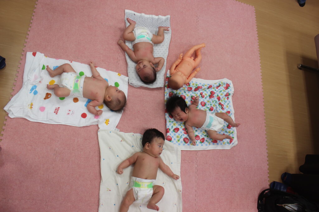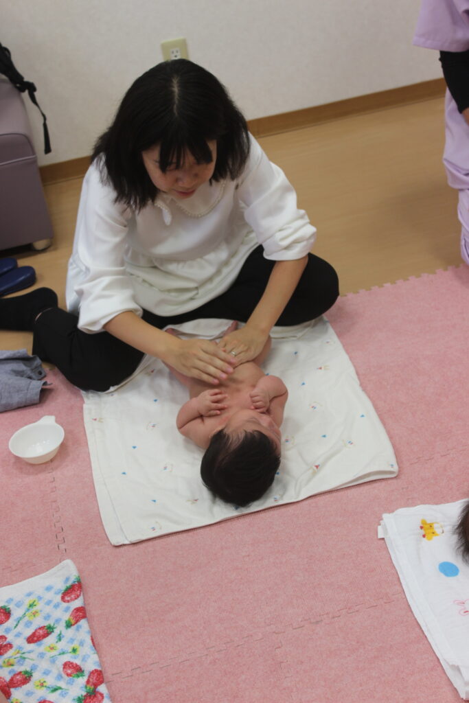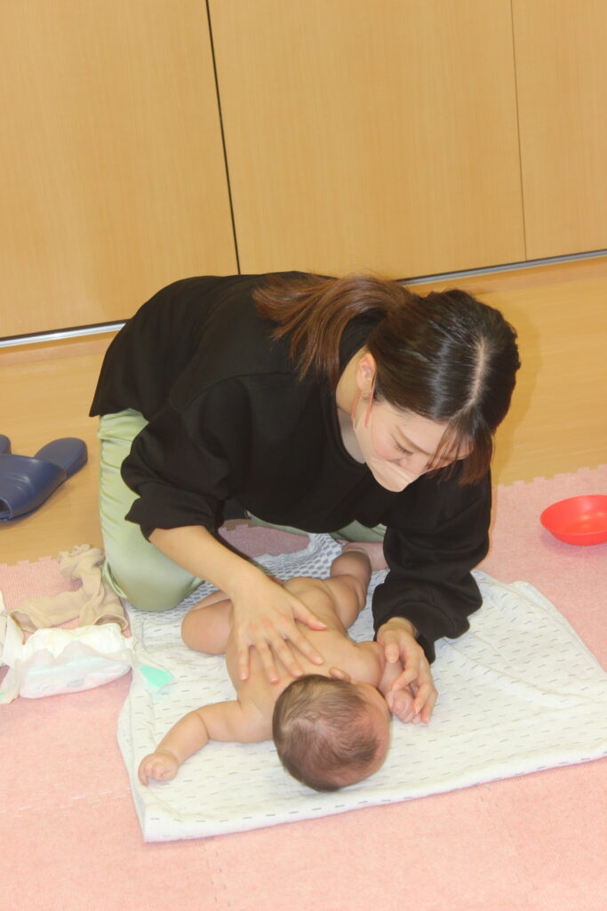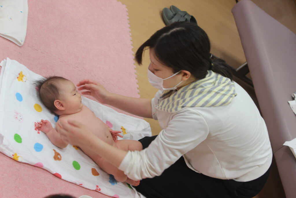 背面も行いますが、うつ伏せをまだしたことがない不安な方は、看護師がお手伝いしますので、ご安心ください。お腹が少し圧迫されるのが安心するのか、案外うつ伏せが好きなベビーちゃんも多いです。